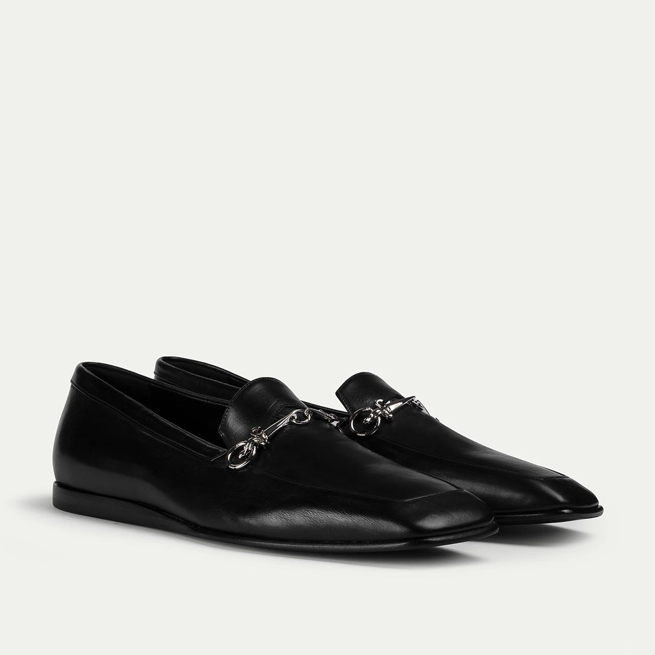 This brushed calfskin loafer, with its elegant, elongated silhouette, is enhanced by a metal detail, offering a blend of classic style and modern sophistication.