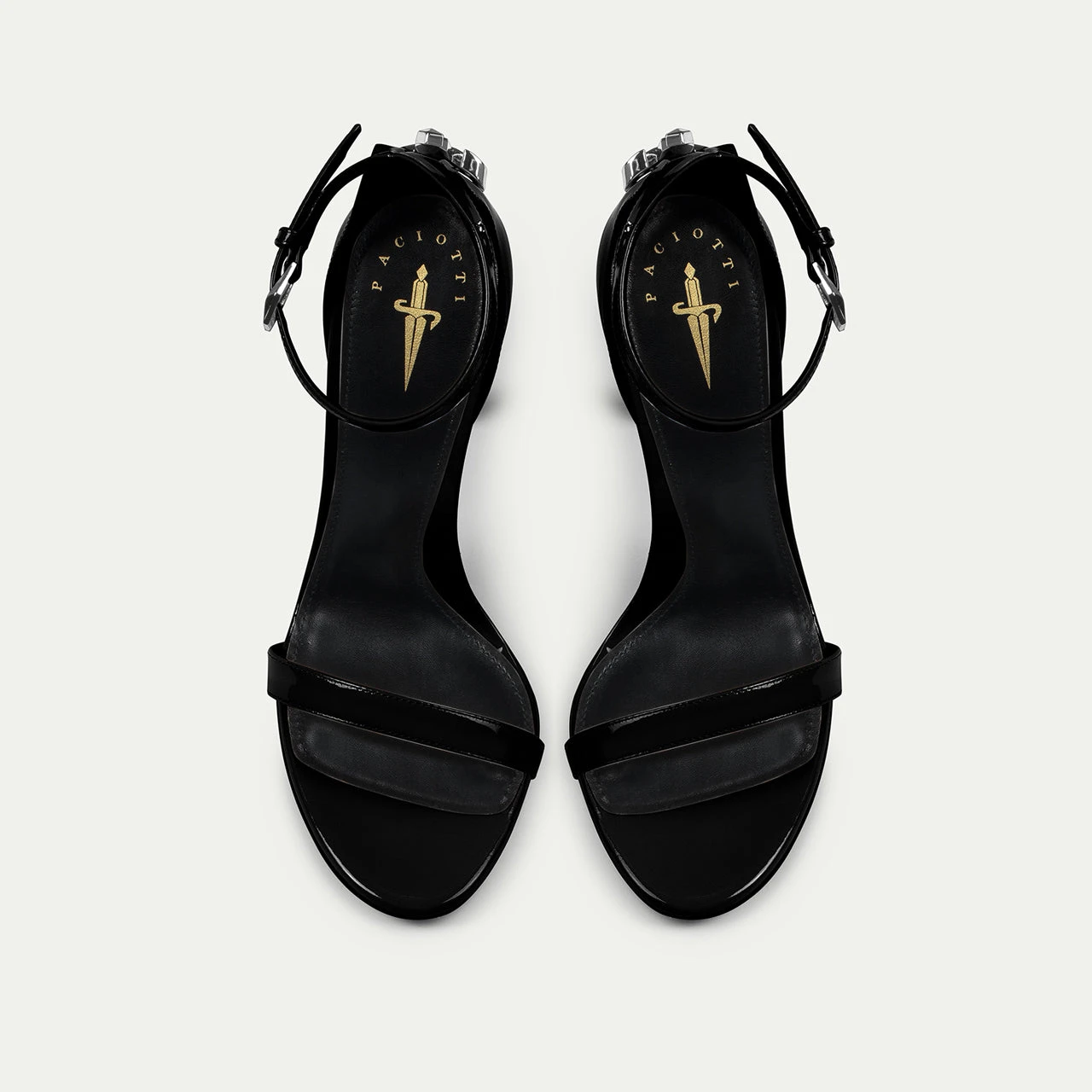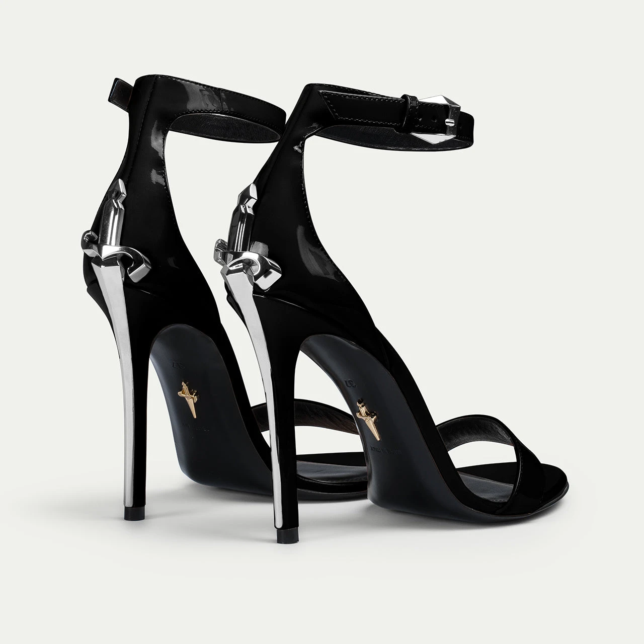 Elegant black tones meet daring design in this sandal. The delicate strap subtly pairs with the sharp silver metal stiletto heel, a bold reinterpretation of the maison’s iconic dagger.