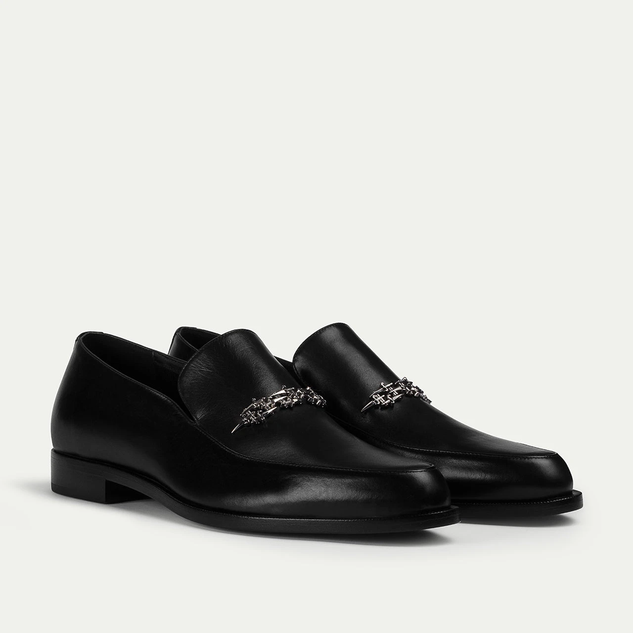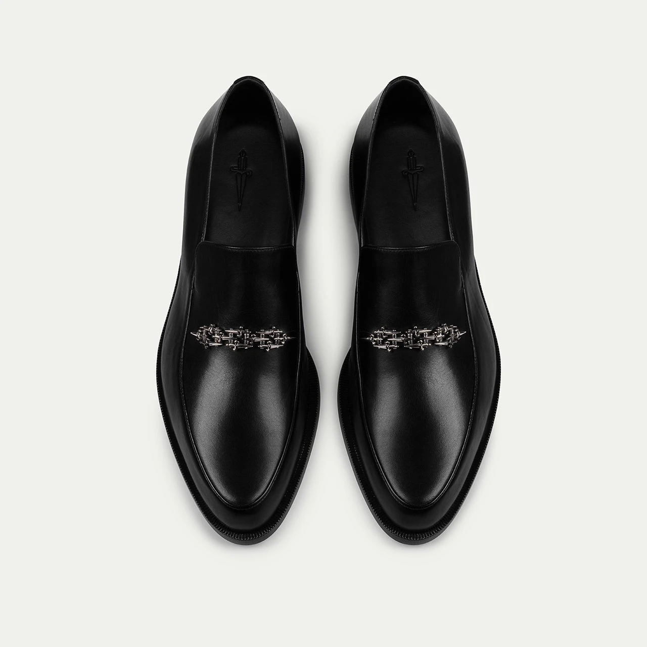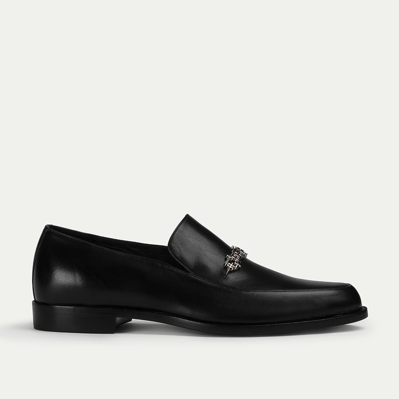 This calfskin loafer, with its elegant, elongated silhouette, is completed by a signature metal detail, offering a blend of classic style and modern sophistication.