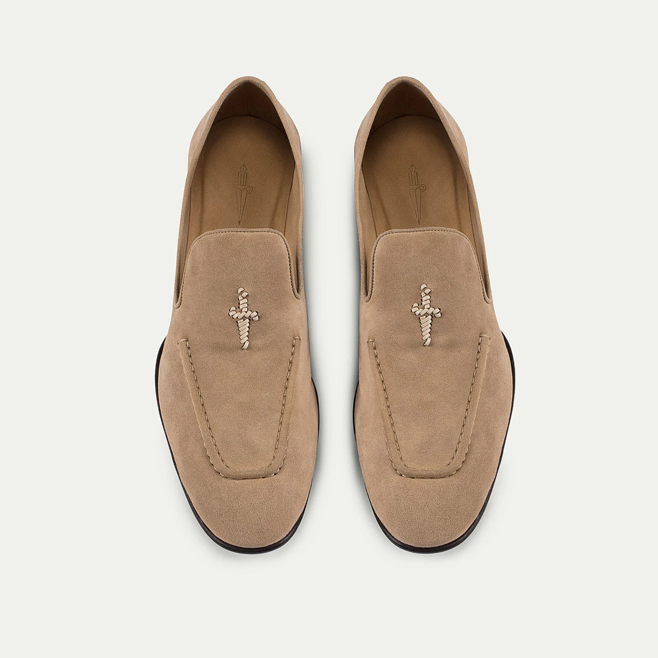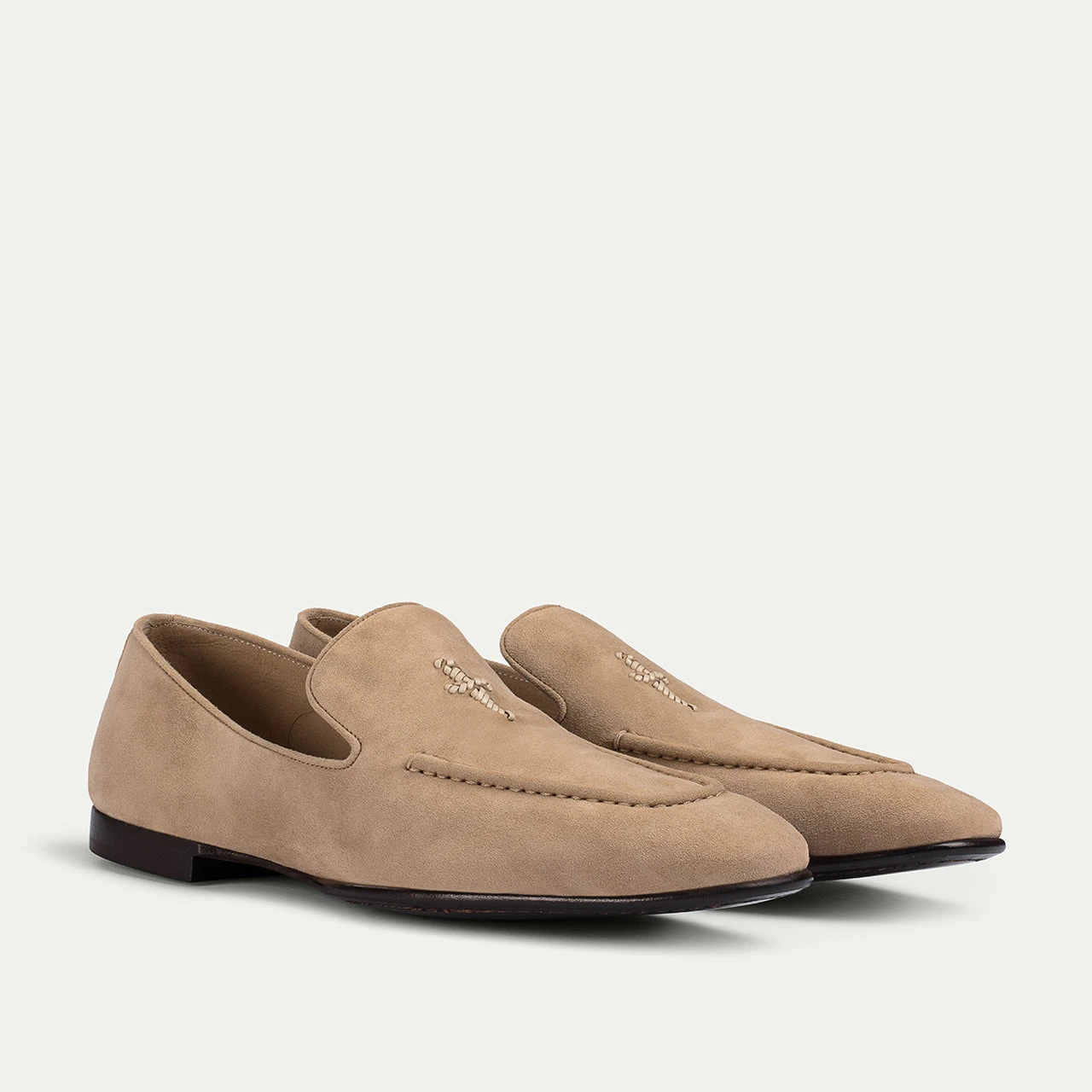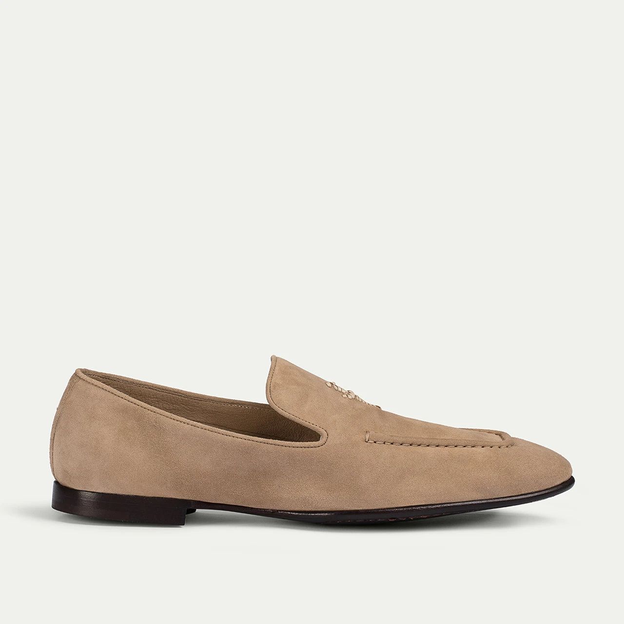 This cashmere and calfskin loafer, with its elegant, elongated silhouette, is completed by subtle logo detail, offering a blend of classic style and modern sophistication.