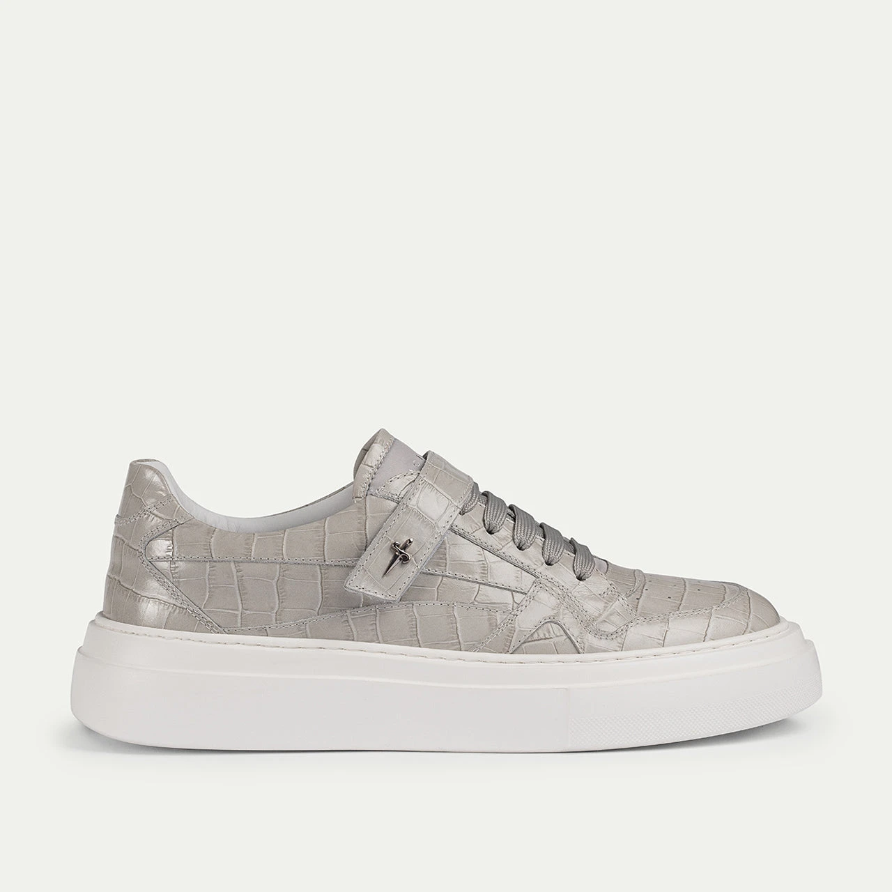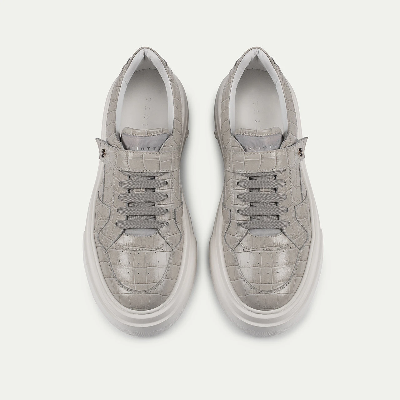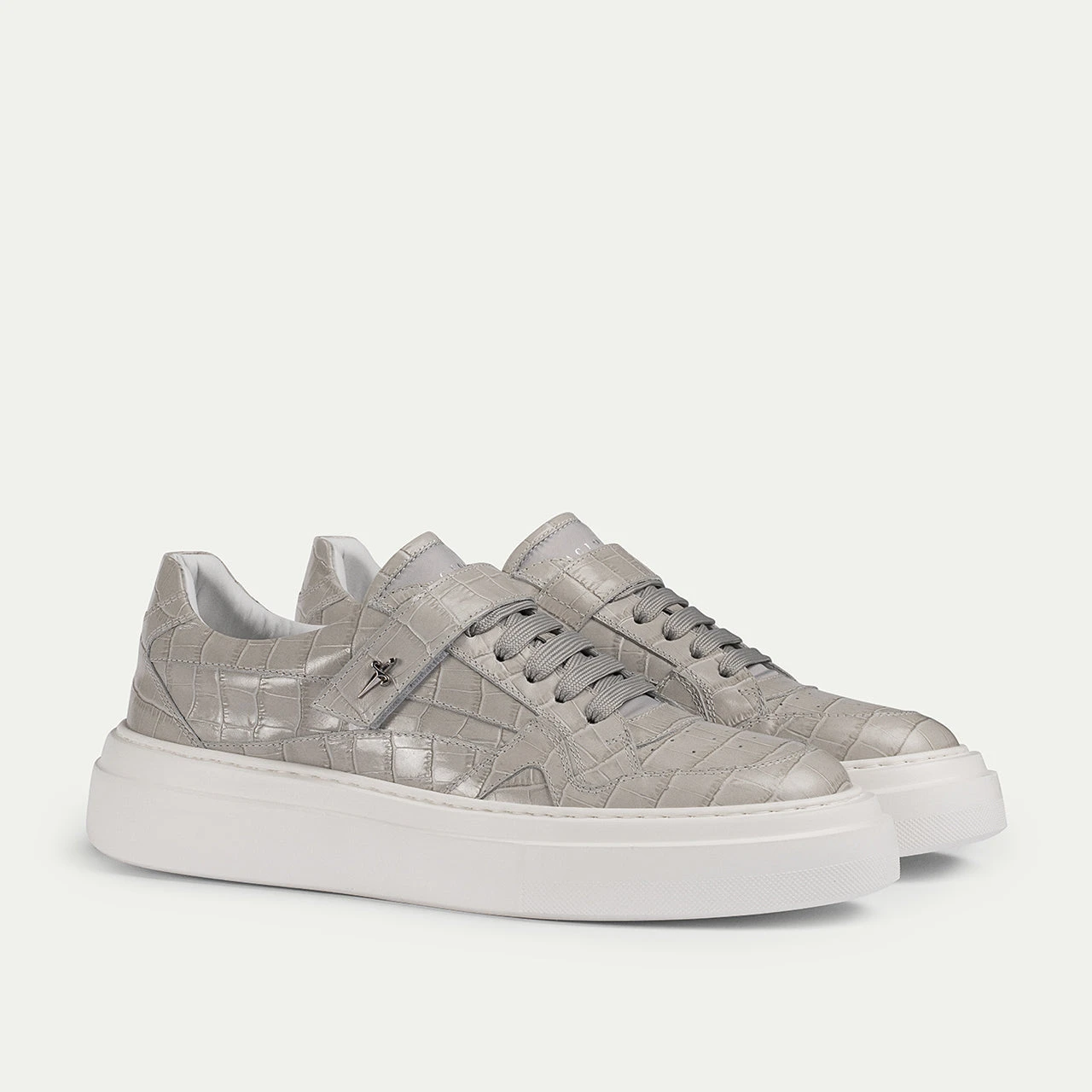 A Paciotti sneaker, masterfully rendered in printed calfskin and canvas, showcasing clean lines. The platform sole and signature dagger detail on the strap enhance its essential silhouette, delivering a look that transitions effortlessly from athletic to chic.